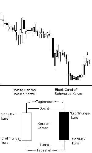 Schließt der Schlußkurs unter dem Eröffnungskurs, so wird eine schwarze Kerze dargestellt.