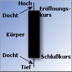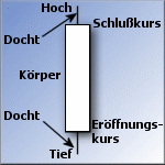 Der Kerzenkörper gibt dabei die Spanne zwischen Eröffnungs- u. Schlußkurs wieder.