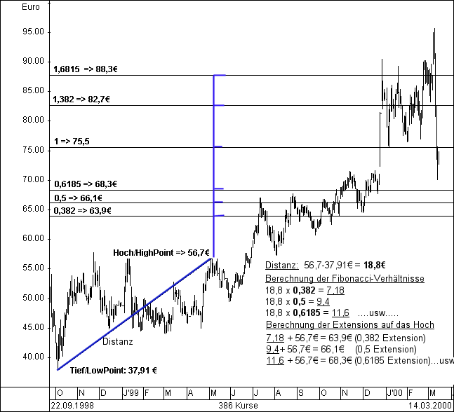 Anschließend wird diese Distanz mit den Fibonacci-Ratios (0,382/0,5/0,6815/1,0/1,382/etc...) multipliziert.