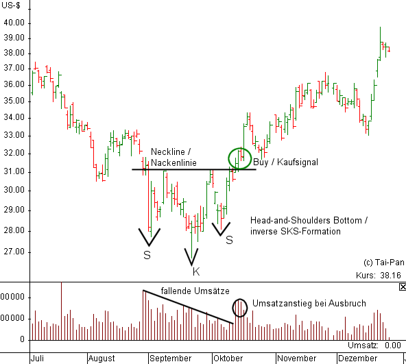 In einem Abwärtstrend wird sie als "inverse SKS-Formation" (Head-and-Shoulders Bottom)