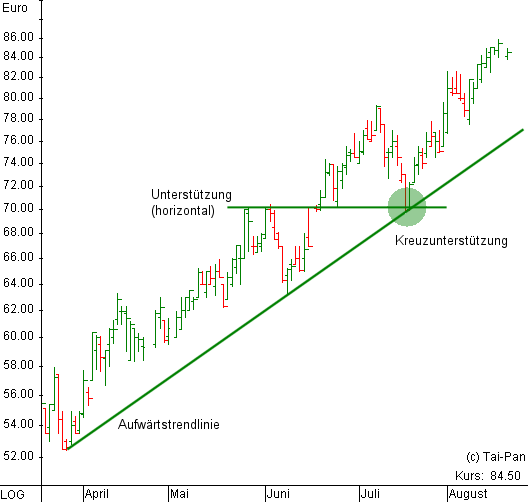 Kreuzunterstützung Eine Kreuzunterstützung entsteht, wenn sich eine Aufwärtstrendlinie und