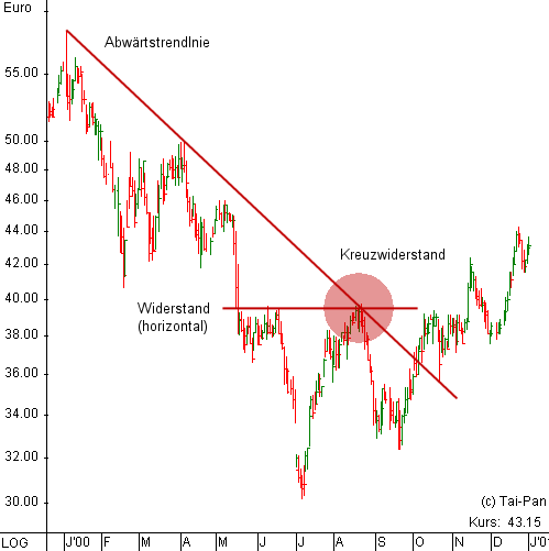 Kreuzwiderstand Bei einem Kreuzwiderstand trifft eine Abwärtstrendlinie auf einen horizontalen Widerstandslinie.