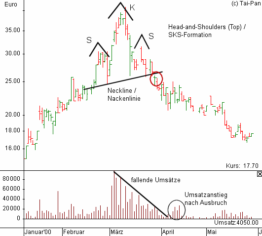 Diese Formation heißt im Aufwärtstrend SKS-Formation (Head-and-Shoulders Top).
