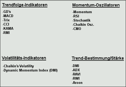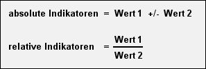 Indikatoren lassen sich in absolute Indikatoren (Trendfolger) und relative Indikatoren (Oszillatoren) unterscheiden.